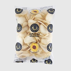 Deze (neutrale) kroepoek is gemaakt van tapiocameel, tarwebloem, zonnebloemolie, garnalen, suiker, zout en ei.